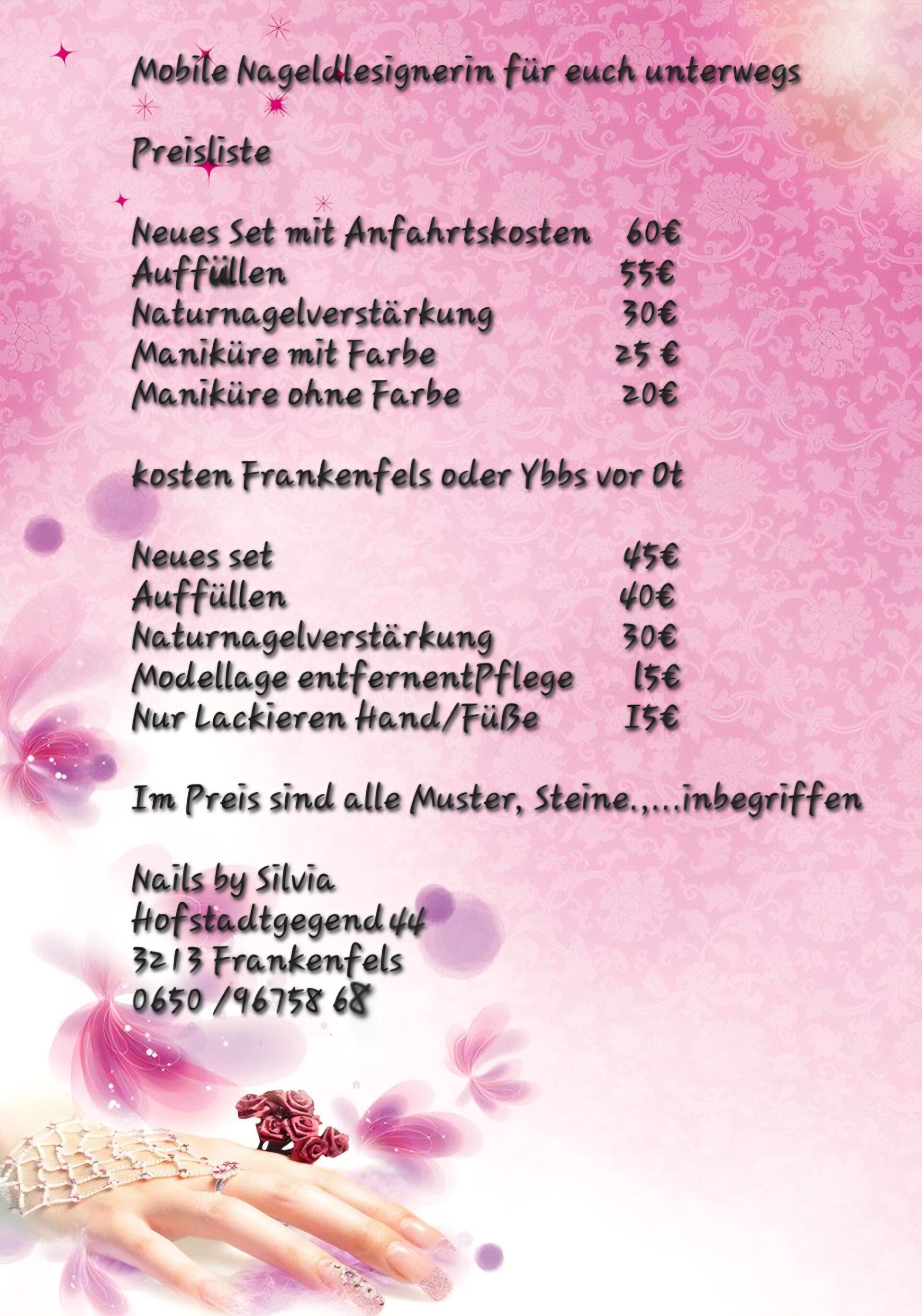 Haben Sie Fragen oder möchten Sie einen Termin vereinbaren? Kontaktieren Sie mich gerne unter 0650 9675868! Nails by Silvia